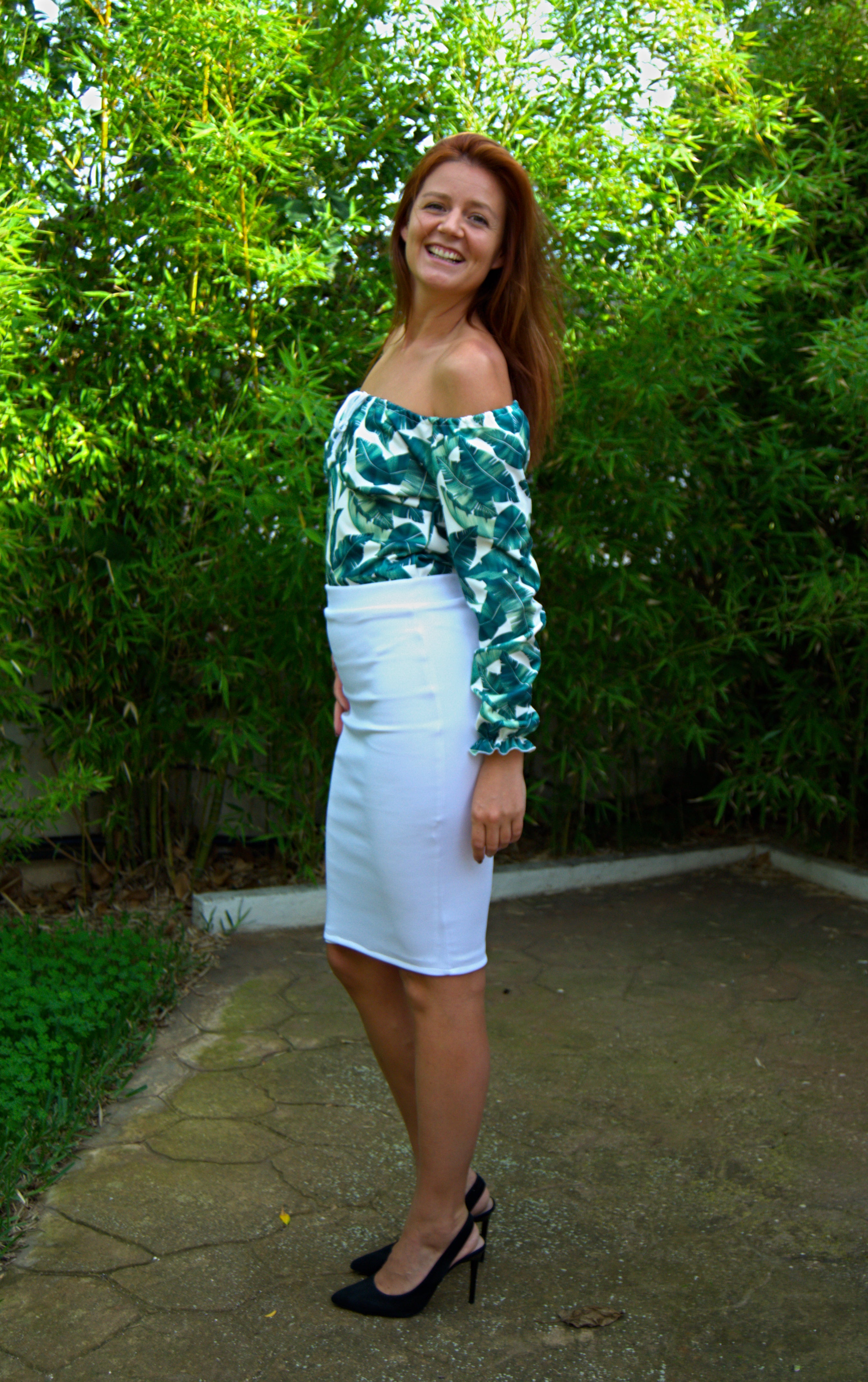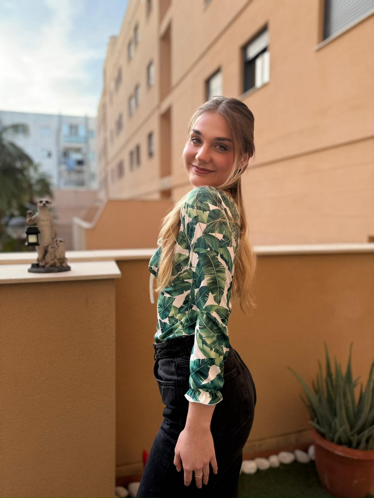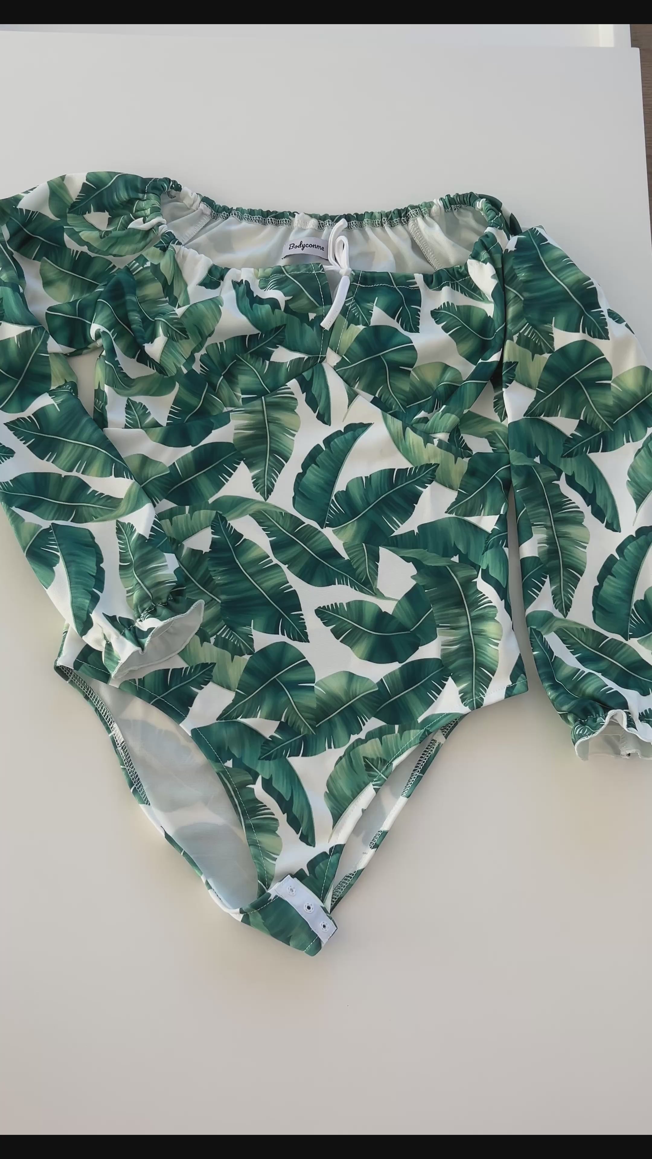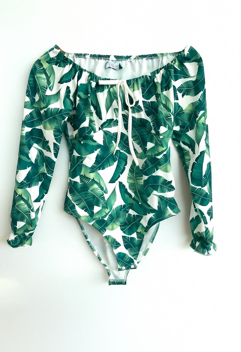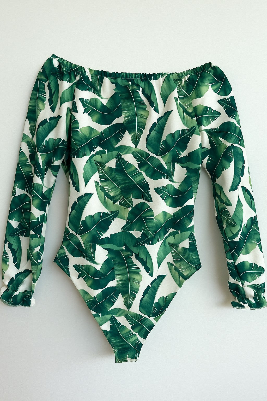 Body mujer manga larga ajustado con detalle de hombros descubiertos, estilo cuello barca, estampado con hojas tropicales en color verde sobre un fondo blanco. Ideal para ocasiones especiales y combinable con todo tipo de prendas (faldas, vaqueros, shorts, etc.).